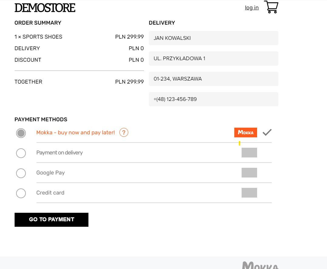 Place the item “Mokka – payment in advance” among the payment methods. Buyers have the option to receive a loan from Mokka and pay immediately.