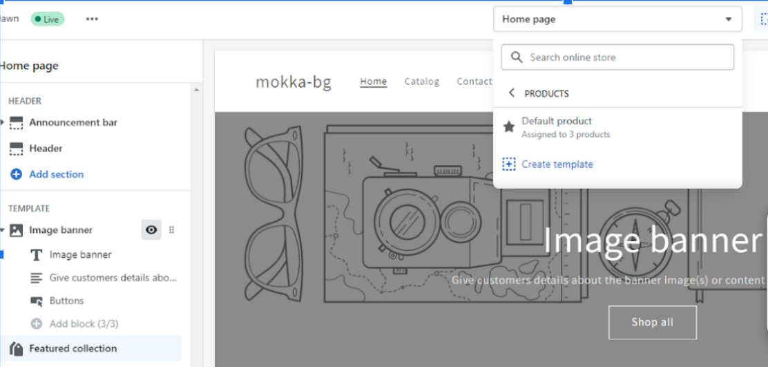 To change the Mokka widget on the product page, in the theme editor open the dropdown item ‘PRODUCTS‘ and select the ‘Default Product‘ template.