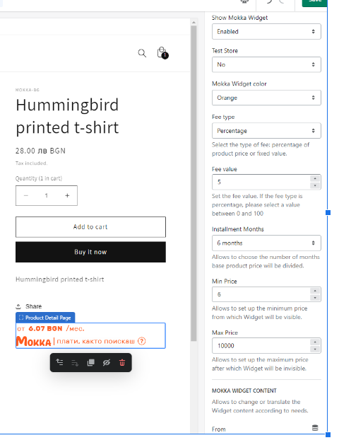 - Fee value – set the value of the Mokka service for the customer. If measured as a percent, and must be between 0 and 100, without adding a percent sign at the end (%). Used to calculate the approximate monthly Mokka payment displayed in the widget.