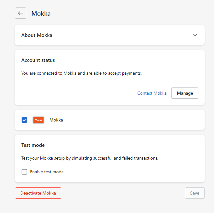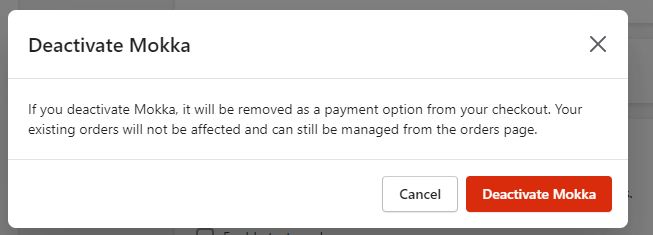 3. You will be redirected to the Mokka payment method management page. Click on the ‘Deactivate Mokka’ button.