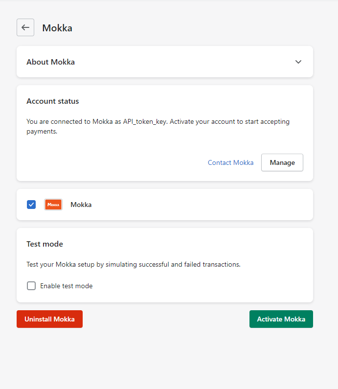 3. Once it has been installed, please go to Settings > Payments > Mokka > Manage page for configuration