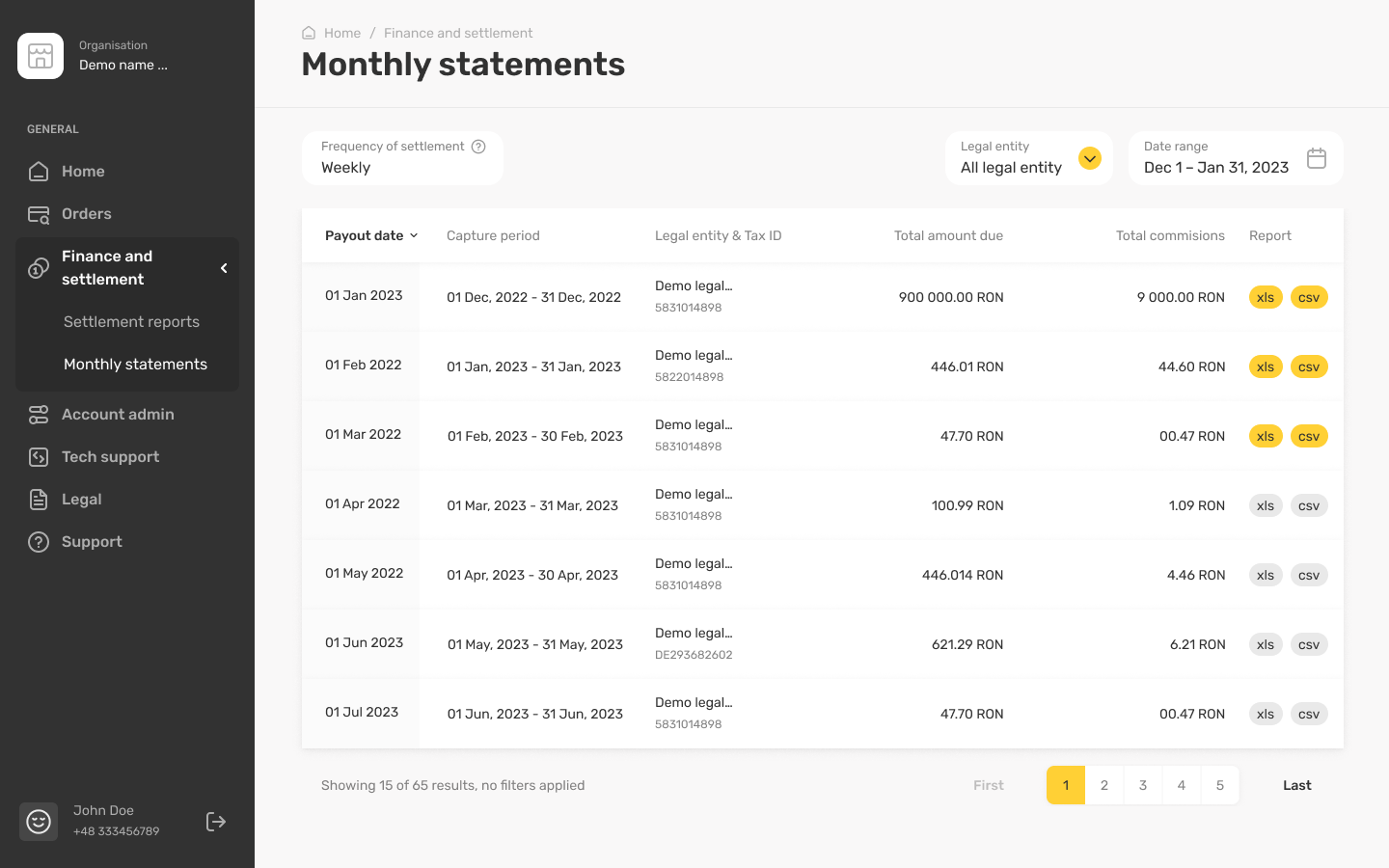 Users with the Administrator or Finance role can access Settlement reports and Monthly statements in the Finance and settlements section.