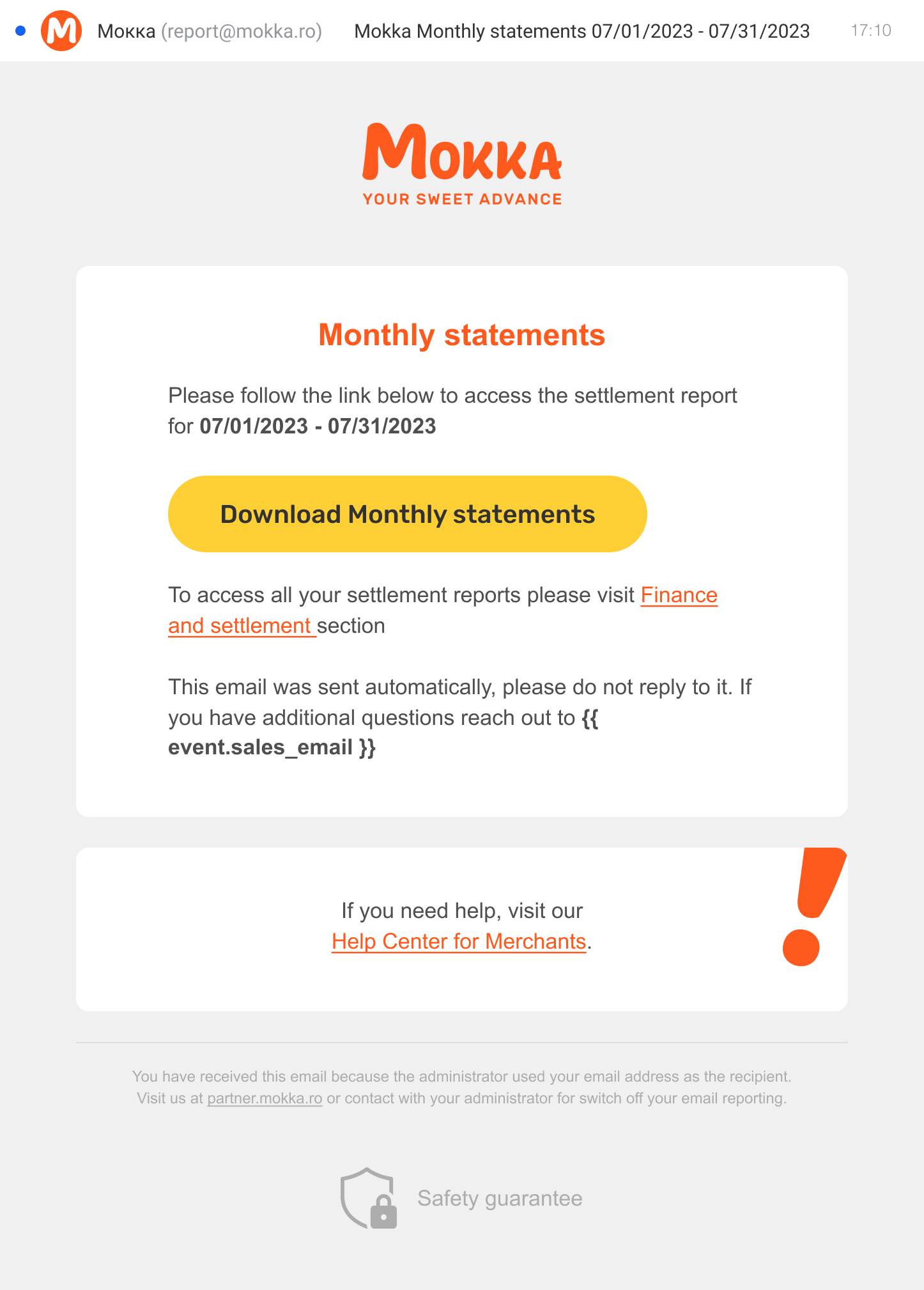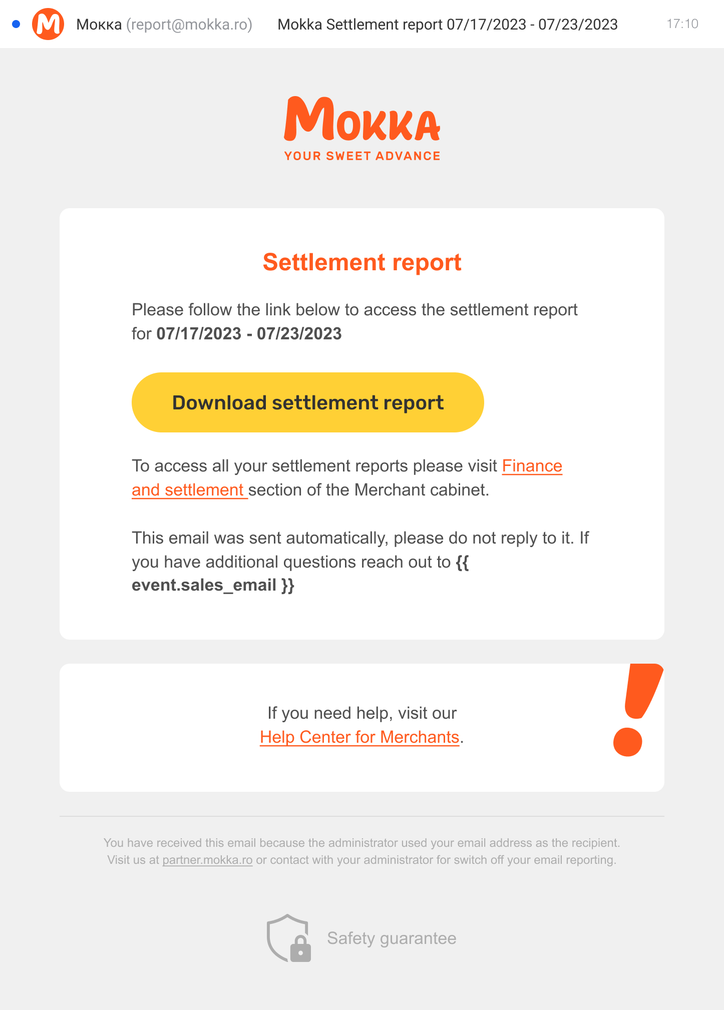 Links to settlement reports and monthly settlements are sent to the administrator’s and finance mailboxes, following the settlement frequency. For monthly settlements, the links are sent on the first day of the next month. A download button will be provided for direct access to the report. To begin the download, the user needs to log in to the Merchant cabinet.
